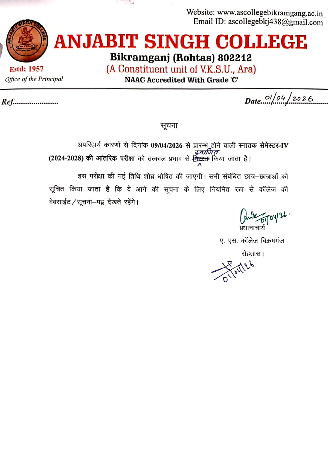 The U.G. Sem.-IV (2024-2028) Internal Examination is postponed due to unaboidable reasons